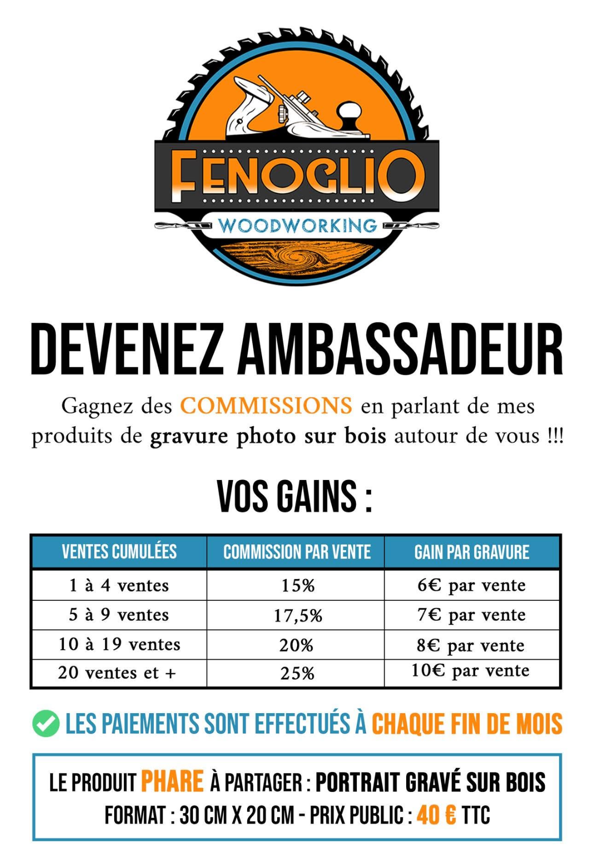 Partagez les gravures FÉNOGLIO WOODWORKING autour de vous et recevez des commissions. Parrainage simple, transparent et rémunérateur.